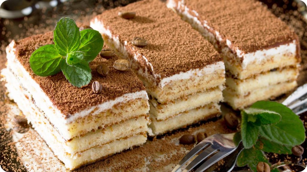 Um dos pratos italianos de sobremesa mais amados. É feito com camadas de biscoitos (savoiardi) embebidos em café, creme de mascarpone e polvilhado com cacau. É a sobremesa perfeita após um longo dia de estudos.