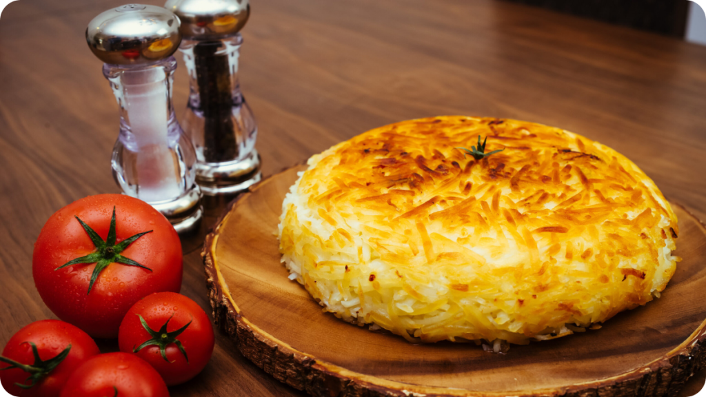 Um prato de origem alemã-suíça. São batatas raladas e fritas na frigideira com manteiga ou gordura, formando uma espécie de panqueca ou torta crocante. O rösti é simples e pode ser servido puro, como acompanhamento, ou coberto com ovo, queijo ou bacon.