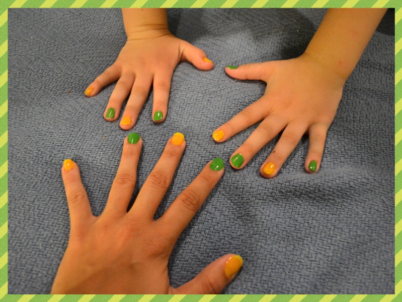 Um dia antes do jogo, fui na Target procurar esmaltes verde e amarelo e falei para minha kid que iríamos brincar de salão de beleza e faríamos as unhas em homenagem ao Brasil! Vejam o resultado:
