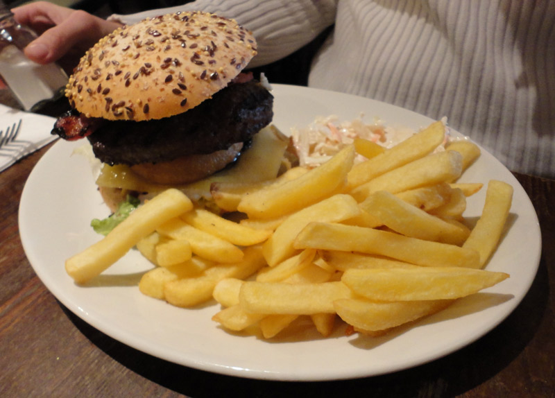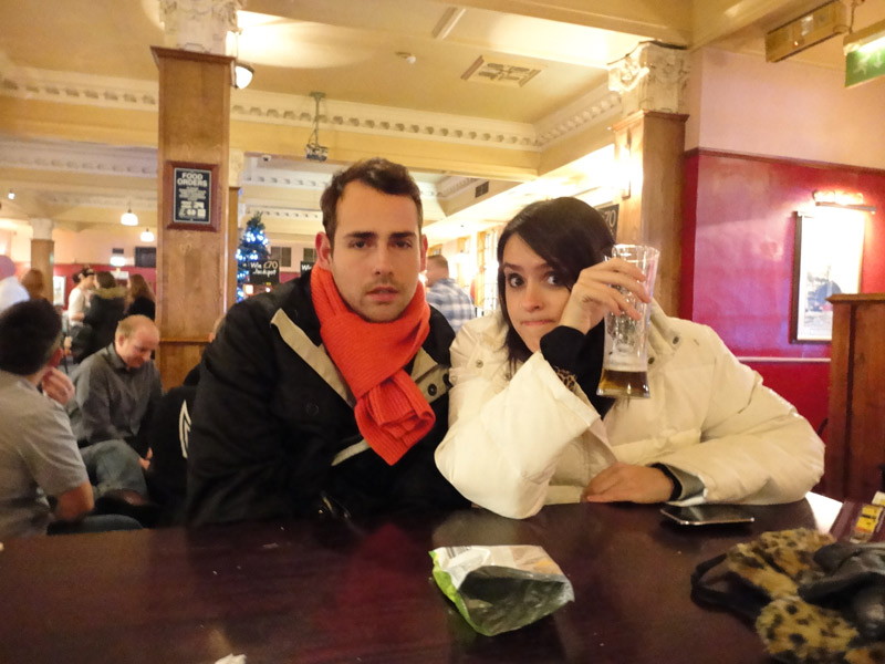 Escolhemos um restaurante chamado Slug & Lettuce, que servia comida típica britânica. Cof cof cof, mentira! Acho que não existe comida típica britânica, sem ser o café da manhã. Aqui só tem restaurantes de outras partes do mundo, mas esse que a gente foi tinham pratos normais, desses que a gente consegue encontrar em pubs e afins.