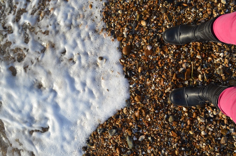 Assim que chegamos na cidade, paramos o carro perto da praia para ver o mar. O engraçado é que a praia não tinha areia, e sim pedras! Já tinha ouvido falar que outra praia aqui na Inglaterra tinha pedras, mas foi super estranho estar lá pessoalmente e ver isso com meus próprios olhos. Como estava muito frio, eu usava bota, então não deu nem pra sentir. Mas deve ser mega estranho ir pra lá de biquíni e ter que tomar sol deitada naquelas pedrinhas duras!