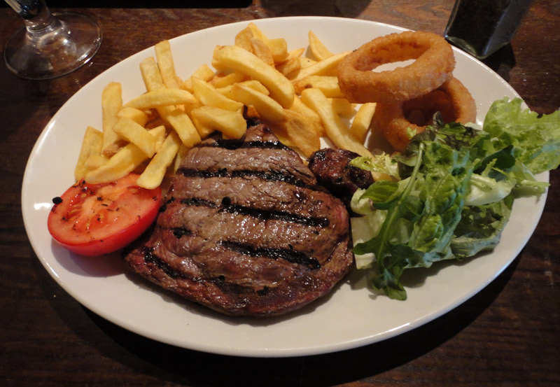 Esse foi meu prato. Um bifão mal passado com batata frita, tomate grelhado e anéis de cebola. Não sou a maior fã de cebola do mundo mas confesso que essas estavam uma delícia e eu acho que comecei a rever meus conceitos.