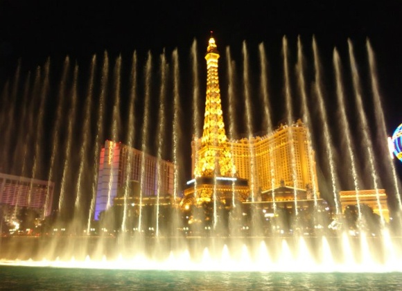 Fontes do Bellagio durante o show das fontes e o Hotel Paris ao fundo!