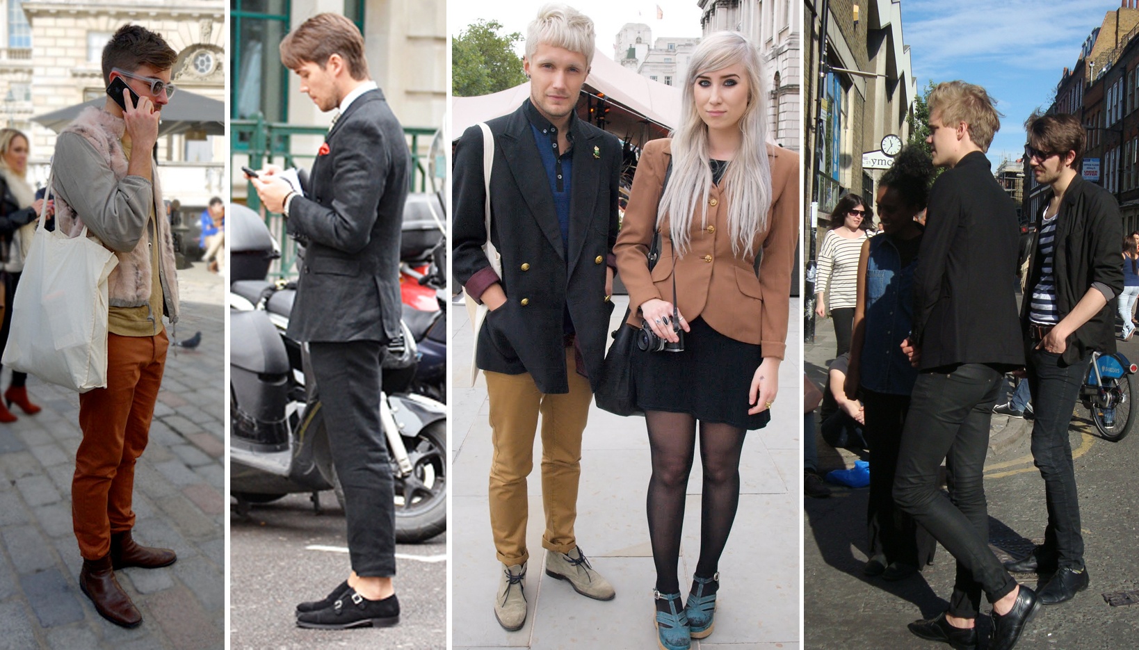 Eu diria que a moda em Londres é bem colorida. Estava acostumada a usar preto, branco e cinza, mas depois que cheguei me deu vontade de comprar calças coloridas, casacos, blusinhas… Eu perdi o medo de combinar cores e estampas e aprendi que fazer sobreposição em um look, tomando o devido cuidado (claro!), não é um bicho de sete cabeças. As cores são bem aproveitadas. Para homens, bastante calça skinny de cores pastéis, e também vinho, bege, verde musgo… Eles pegam a barra da calça, dobram umas 3 ou 4 vezes para aparecer parte da canela e colocam um sapato deslumbrante para combinar com o look. Aliás, outra coisa que me apaixonei aqui foi pelos sapatos. Homens sempre usam sapatos lindos e não tem medo de arriscar! Nada de ficar achando que vai parecer gay ou coisa assim, mesmo porque… desde quando um look dita sua preferência sexual?