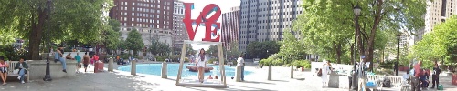 Finalmente… Love Park! É um dos pontos turísticos mais famosos da Filadélfia! Já foi o ponto alto dos skatistas americanos, mas agora é proibido andar de skate lá. Virou uma praça bem bonita e turística, com uma fonte bem grande e o letreiro escrito ‘Love’, que atrai vários casais apaixonados fazendo poses ‘cafonas’ para tirar foto 😛 Gostei!!!