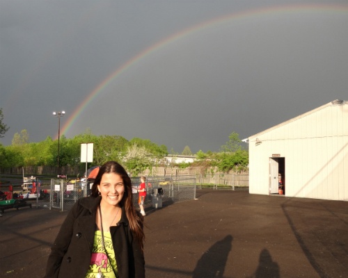 Andamos de kart infantil (3 voltinhas por 5 doletas) num Happy Thymes (aquelas casas de fliperamas que você ganha tickets e troca 500 deles por 1 bala, hahahaha). Foi muito legal! Estava um dia engraçado. Meio chovendo, meio sol. Meio frio, meio calor. Isso resultou num belíssimo arco-íris! Fazia tempo que eu não via um… ou melhor, dois! Na foto não dá pra ver os dois, pois o outro ainda estava fraquinho… mas o carinha do kart não parava de gritar: ‘DID YOU SEE THE DOUBLE RAINBOW? OH MY GOD, IT’S GORGEOUS!!!’ Sério, dava até raiva… aí depois, comentando com meu namorado sobre isso, ele me mandou um vídeo ‘meme’ do Youtube que é um cara emocionado com um double rainbow… desses vídeos com zilhões de visulizações, sabe?! Aí que meu toquei que o cara do kart deveria estar imitando o vídeo, sei lá. Ele está abaixo da foto, para quem tiver curiosidade de assistir (e dar um pouco de risada também!)