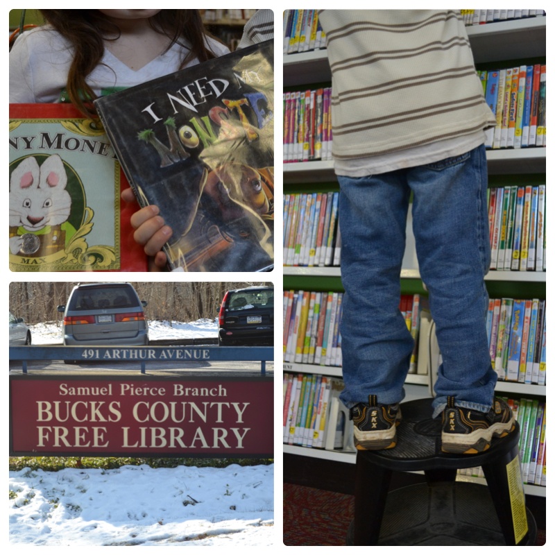 1. Minha menina mostrando os livros que pegou! 2. Biblioteca de Bucks County (ainda estava nevando!) 3. Meu menino no banquinho da biblioteca tentando alcançar alguns filmes