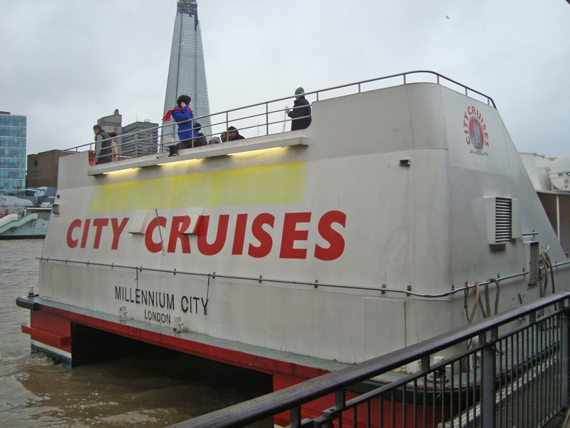 O passeio com o cruzeiro foi bacana porque acabamos indo pro lado de Greenwich, para almoçar em um dos meus pubs preferidos, o Cutty Sark – que inclusive eu já falei aqui no blog nesse post. Na ida pegamos um barco super gostoso e aproveitamos para fugir da chuva. Tava bem friozinho e chovendo um pouco, e dentro do barco tinha banheiro, lanchonete e aquecedor. Bem confortável!