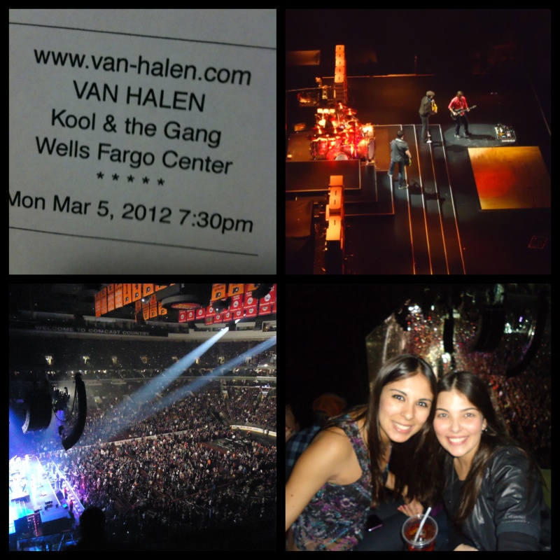 Umas 9 da noite, Eddie Van Halen e David Lee Roth entraram no palco alucinando! Sério, pareciam garotinhos ginastas de uns 15 anos de idade de tanto que pulavam e dançavam! A voz do David, é claro, já não está mais lá aquelas coisas, mas só ele é um SHOWMAN! Valeu a pena!!! Pegamos um lugar MUITO bom, onde consegui ver o palco inteirinho de cima e não perdi nenhum movimento do show. O Wells Fargo Center é um lugar bem pequeno, se comparado com os estádios a céu aberto de futebol que eu costumava assistir shows no Brasil (como o Pacaembu e Morumbi, em São Paulo). Tivemos assentos marcados e foi tudo extremamente organizado. Fiquei emocionada de ter conseguido ver tudo! Como eu queria ter a mesma oportunidade com outras bandas que gosto… ainda tenho mais uns bons meses pra curtir aqui nos EUA. Quem sabe, né?